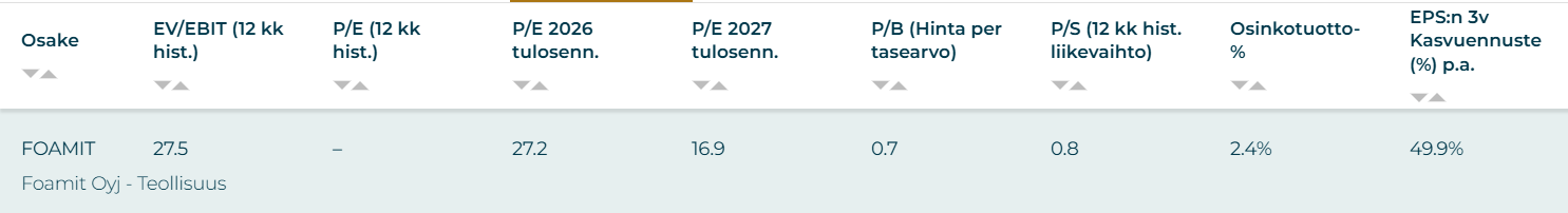 Kuluvana vuonna analyytikot odottavat Foamitin yltävän 0,03 euron osakekohtaiseen tulokseen. Kirjoitushetken osakekurssilla Foamitin P/E-luku vuoden 2026 tulosennusteella on 27,2. Viime vuoden 0,02 euron osakekohtaisella tuloksella P/E on 42. Vaikka arvostus on lyhyellä aikavälillä tarkasteltuna korkea, perustuu Foamitin osakkeen hinnoittelu yhtiön kasvupotentiaaliin, vahvaan ennustettuun tuloskasvuun ja vankkaan taseeseen.