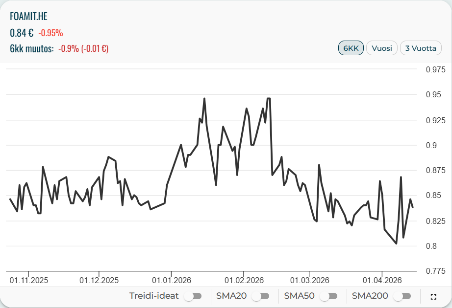 Viime kuukausina Foamitin osake on ollut pitkälti vaakatasolla kulkeneessa trendissä. Osake starttasi vuoteen 0,84 euron kurssitasolta ja kävi tammi-helmikuun aikana korkeimmillaan 0,95 eurossa. Tältä tasolta osake on palannut maalis-huhtikuun aikana aiemmalle, noin 0,80-0,87 euron vaihteluvälille.