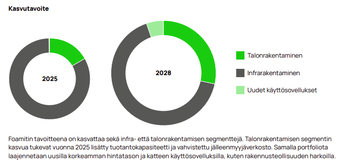 Kasvunäkymää tukevat etenkin vuoden 2025 lopun vahva 23,8 (18,6) milj. euron tilauskanta ja vaahtolasin mittava 952 000 (786 000) kuutiometrin tarjouskanta. Vuoden 2025 aikana Foamit avasi toimituksia myös uusiin käyttösovelluksiin, kuten betoniteollisuuden kevenneratkaisuihin ja vedenpuhdistukseen, ja lisäksi yhtiö on kertonut tutkivansa vaahtolasin käyttömahdollisuuksia puolustusteollisuuden ratkaisuissa.