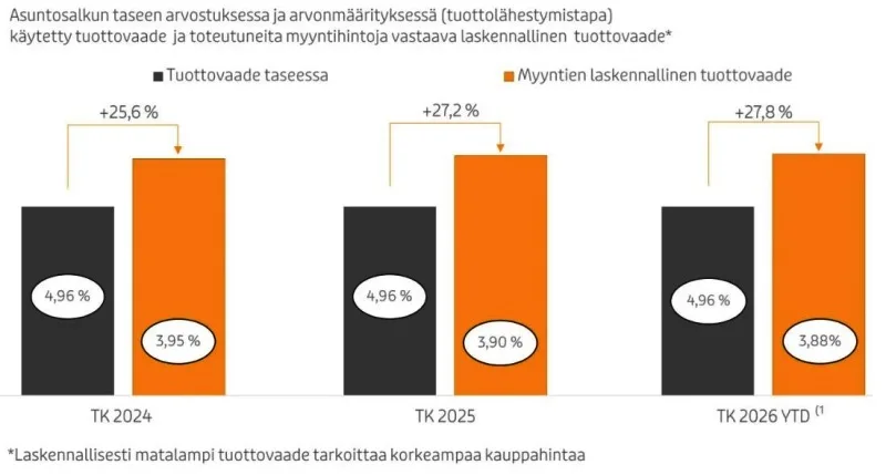 Yhtiö on kyennyt myymään Tallinnan asuntoja noin neljän prosenttiyksikön tuottovaateella, kun ne taseessa on määritelty viidellä prosentilla. Tämä siis tarkoittaa noin neljänneksen korkeampia myyntihintoja kuin mihin asunnot on arvostettu yhtiön taseessa.