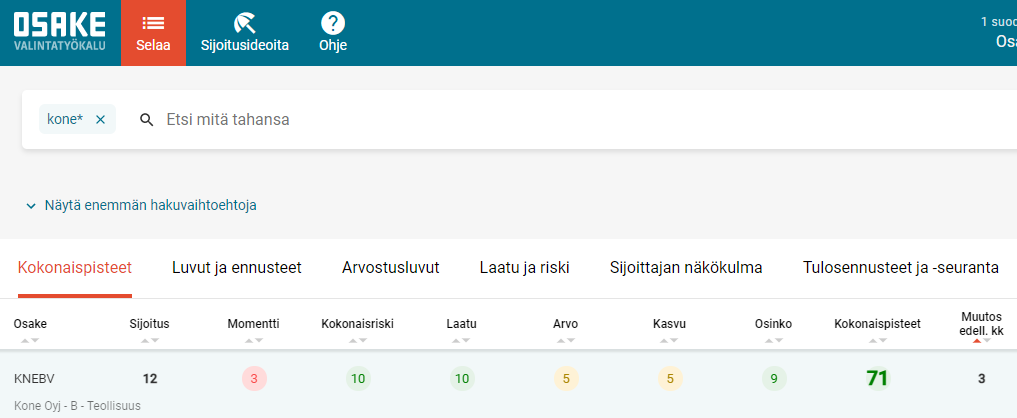 Sijoittaja.fi:n Osaketyökalulla löydät houkuttelevimmat ja sijoitustyyliisi sopivat osakkeet. Osakkeet pisteytetään eri ominaisuuksien perusteella ja jokaiselle osakkeelle lasketaan Sijoittaja.fi:n kokonaispisteet. Historiallisesti Sijoittaja.fi-kokonaispisteiden perusteella sijoittamalla sijoittaja olisi voinut päihittää markkinat merkittävällä erolla.