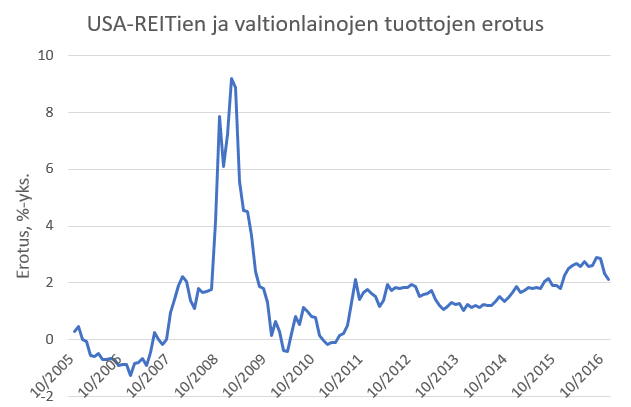Alla on kuvattu REITtien osinkotuoton ja valtionlainojen tuottojen erotus. Tällä hetkellä tuottoero on edelleen poikkeuksellisen suuri yli 2 %:ia. Jos historiaan on uskominen, tämä voi jälleen tarjota houkuttelevan ostopaikan.
