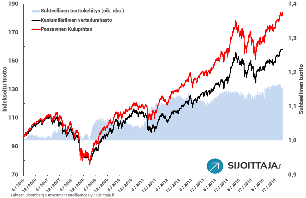 Passiivinen Kulupihtari -mallisalkkumme tuotti maaliskuussa +0,9 % ja vertailurahastot tuottivat +0,7 %. Vuoden alusta kulupihtari on tuottanut +3,8 % ja vertailurahastot +3,3 %. Pitkässä juoksussa Suomen suosituimmista yhdistelmärahastoista koostettu salkku on hävinnyt mallisalkullemme. Tuottoeroa on kertynyt mallisalkun hyväksi kymmenessä vuodessa yli 24 %-yksikköä. Ero syntyy pääosin kuluerosta. Mallisalkkumme hallinnointikustannus on vain noin 0,2 %, kun hallinnointikustannus rahastosalkussa on 1,5 %.