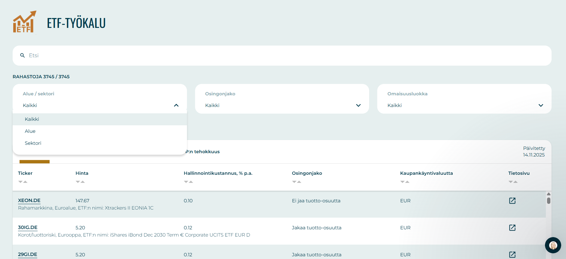 ETF-työkalulla voit hakea ja vertailla ETF-rahastoja lukuisilla eri kriteereillä.