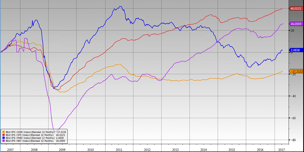 Kuten alla olevasta kuvasta voi havaita, tulosfundamenttien kehitys on ollut kokonaisuudessaan nihkeää kahdeksan vuotta kestäneellä osakemarkkinoiden nousujaksolla. Kuvaajassa on esitetty seuraavan 12 kuukauden tulosodotusten prosentuaalinen muutos paikallisvaluutoissa mitattuna viimeisen 10 vuoden ajalta. Kuvaajasta voi nähdä, että Yhdysvalloissa (S&P 500 -indeksi, punainen) tulokset ovat nousseet noin 40 %:ia 10 vuodessa ja Japanissakin (Nikkei 225-indeksi, violetti) mukavat 26 %:ia. Kehittyvillä markkinoilla (MSCI Emerging Markets -indeksi, sininen) mm. Venäjän ja Brasilian ongelmat näkyivät selvänä pudotuksena vuoden 2015 ympärillä, mutta nyt sielläkin nousutrendi on selvä. Euroopassa (Euro Stoxx -indeksi, keltainen) tulosten kehitys on ollut aneemista, mutta selvästi piristymään päin.