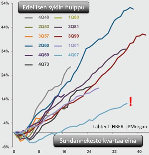 Sijoittajien on hyvä muistaa, että nykyinen talouden elpymissykli on ollut historiallisesti tarkasteltuna poikkeuksellisen pehmeä. Alla oleva kuvaaja vertailee eri taloussyklien kehitystä BKT:n palautumisena edellisen syklin huipusta aina kyseisen syklin huippuun asti Yhdysvalloissa. Kuvaajasta on helppo huomata, kuinka aneemista talouskasvun elpyminen on ollut (alin punaisella huutomerkillä korostettu käyrä). Muissa länsimaissa talouskasvun elpyminen on ollut keskimäärin vieläkin vaimeampaa, mikä on heijastunut esimerkiksi Euroopassa myös heikkona tuloskehityksenä (kuva yllä). Syyt heikkoon kehitykseen ovat olleet jossain määrin vaikeasti selitettävissä ekonomisteillekin, vaikkakin esimerkiksi väestön ikääntymisellä on kyetty osa heikkoudesta selittämään. Sen sijaan heikko tuottavuuskehitys (”productivity puzzle”) on ollut ekonomisteille vaikeampi mysteeri selitettäväksi ja yleisesti ekonomistit odottavat Yhdysvaltainkin rakenteellisen talouskasvun yltävän hädintuskin kahteen prosenttiin (erinomainen syventävämpi katsaus aiheeseen löytyy bondiguruna pidetyn Bill Grossin tuoreesta kuukausikatsauksesta täältä).