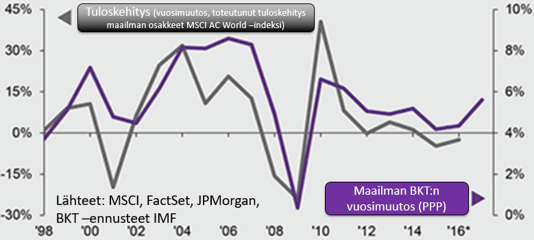 Alla oleva kuvaaja muistuttaa puolestaan siitä, että jatkossakin yritystulokset vaativat talouskasvua pysyäkseen kasvu-uralla. Talouslukujen aito parantuminen on edellytys sille, että tuloskasvu ja siten osakemarkkinoiden nousu voi jatkua terveellä pohjalla. Hyvänä puolena on se, että talouskasvuennusteita on nostettu laajasti eri puolella maailmaa Yhdysvaltain ulkopuolella.