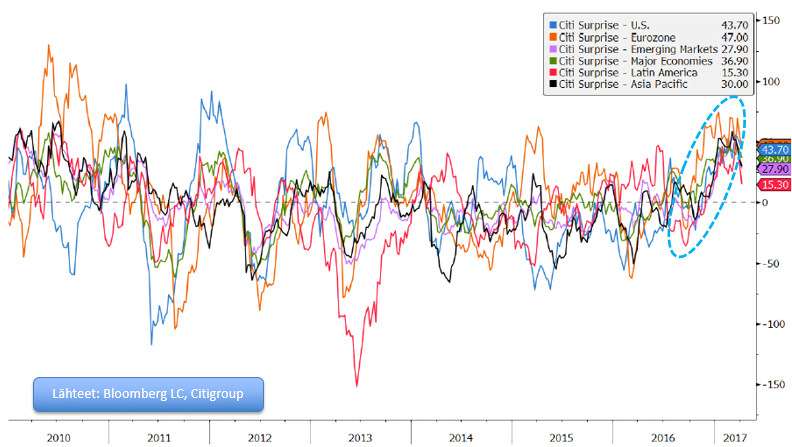 Viime kuukausien osakemarkkinaralli lienee pohjautunut pitkälti talouslukujen positiivisiin yllätyksiin ympäri maailmaa (ei niinkään herra Trumpiin, vaikka monet ovat hänelle kunniaa tarjonneet!).