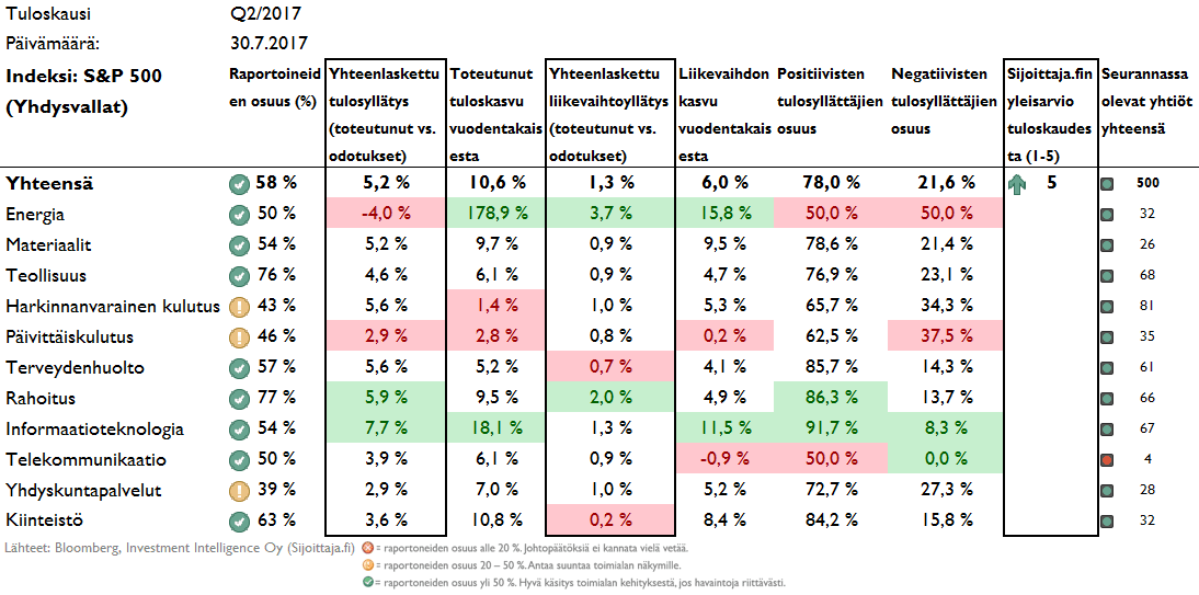 Sektoreista positiivisin yllättäjä on ollut informaatioteknologia, jonka hyvät näkymät nostimme myös edellisessä tuloskatsauksessamme. Teknologiayhtiöiden tuloskasvutrendin on jatkunut vahvana ja tuloskasvua vuodentakaisesta on kirjattu peräti 18,1 %:ia. Yhtiötasolla etenkin Facebook, Alphabet (Google) ja Intel ovat kontribuoineet eniten positiiviseen yllätykseen, mutta yllätykset ovat tulleet laajasti, sillä sektorin yrityksistä peräti 91,7 %:ia on kertonut odotuksia paremmasta tuloksesta, mikä on poikkeuksellisen korkea luku. Toiseksi parhaat yllätykset löytyvät rahoitussektorilta. Heikoimmin on mennyt energiasektorilla, joiden tulosten palautuminen kuopasta on jäänyt 4 %:ia analyytikoiden odotuksia heikommaksi ja 50 %:ia yllättänyt negatiivisesti.