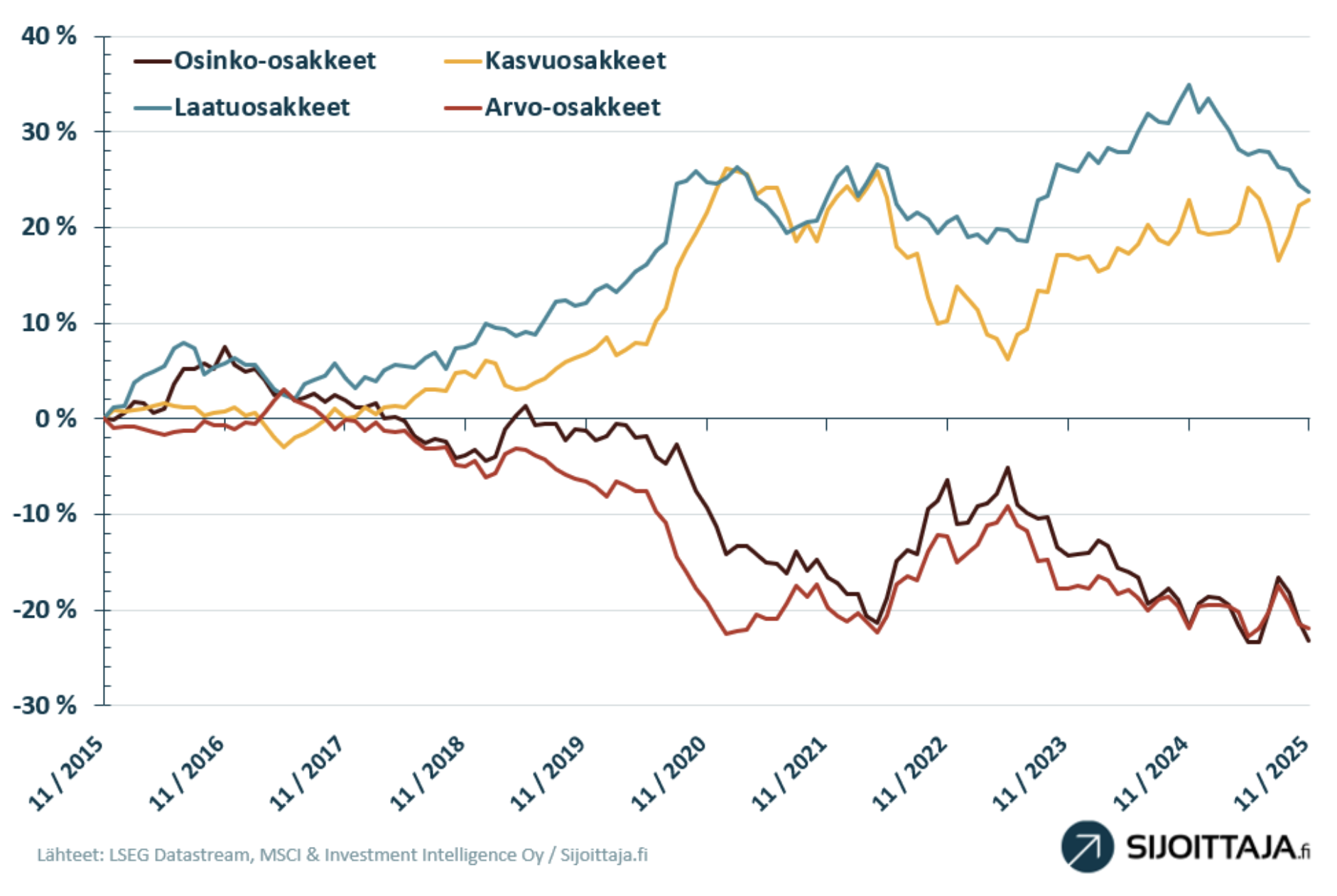 Kasvuyhtiöihin (oranssi viiva) sijoittaminen on ollut valtaosan viimeisestä kymmenestä vuodesta parhaita sijoitustyylejä. Etenkin vuonna 2020 koronaviruspandemian eniten kurittaessa markkinoita, kasvuyhtiöt suoriutuivat todella hyvin. Sen sijaan vuosi 2022 oli kasvuosakkeille todella rankka. Alla olevassa kuvassa on neljän tunnetun sijoitustyylin 10 vuoden tuottoja suhteessa MSCI World -markkinaindeksiin.