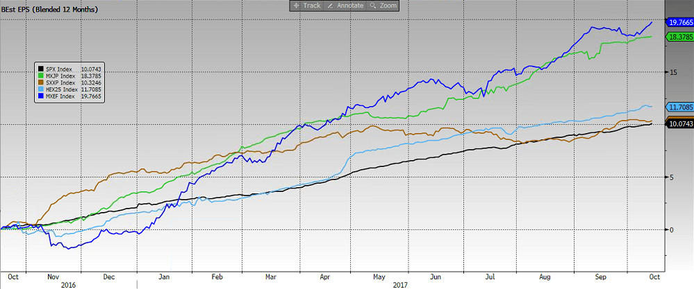 Alla olevasta kuvaajasta voi havaita tuloskasvuodotusten (seuraavat 12 kuukautta) kehityksen eri puolella maailmaa. Viimeisen vuoden aikana analyytikoiden tuloskasvuodotukset paikallisvaluutoissa mitattuna ovat nousseet etenkin kehittyvillä markkinoilla +19,7 % (sininen) ja Japanissa +18,4 % (vihreä). Sen sijaan Suomessa +11,7 % (turkoosi) ja Yhdysvalloissa +10,1 % (musta) tuloskasvuodotusten kulmakerroin on ollut maltillisempi. Hieman yllättäen Euroopan tuloskasvuodotus on pysynyt jokseenkin toukokuun tasolla (ruskea) piristyneistä talouden näkymistä huolimatta.