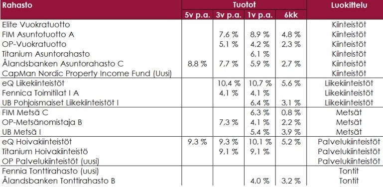 Alla olevassa taulukossa on esitetty valittujen Suomeen rekisteröityneiden reaaliomaisuuteen sijoittavien rahastojen historiallisia tuottoja (per 28.2.2018). Silmämääräisesti tarkastellen tuotot ovat olleet erinomaisia ja tuottokehitys tasaista. Hyvien tuottojen taustalle kätkeytyy monissa rahastoissa kuitenkin myös melko voimakasta tuottovaateiden laskua, joka on nostanut laskennallisia tuottoja alla olevia kassavirtaperusteisia tuottoja suuremmiksi.