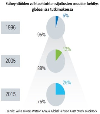 Alla olevassa kuvaajassa on esitetty vaihtoehtoisten sijoituskohteiden osuuden kehitys eläkeyhtiöiden salkuissa. Vaihtoehtoiset sijoitusluokat ovat nousseet 90-luvun puolivälin yksittäisistä prosenteista jo neljännekseen vuonna 2015 ja trendi vaikuttaa olevan edelleen kasvamaan päin seuraten maailman suurimpien yliopistojen lahjoitusrahastojen trendiä.