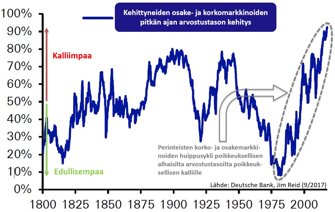 Alla oleva kuvaaja tiivistää yhdellä käyrällä arvostustasojen pitkän aikavälin kehityksen perinteisillä kehittyneiden markkinoiden osake- ja korkomarkkinoilla (per 9/2017). Kuvaajan on laatinut maailman arvostetuimpiin sijoitusstrategeihin kuuluva Deutsche Bankin Jim Reid tiimeineen yhdistäen useita pitkän aikavälin arvostusmittareita. Ei siis ihme, että vaihtoehtoisten sijoitusluokkien tarjoamat mahdollisuudet ovat kasvattaneet suosiotaan.
