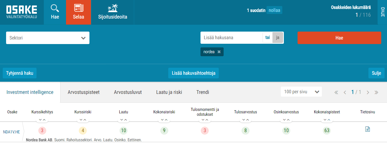 Osavuosikatsauksen kooste, tärkeimmät tunnusluvut ja sijoittajan näkökulma Osaketyökalusta. Siirry työkaluun, kirjoita hakukenttään Nordea ja avautuu yhtiön tiedot. Tietosivu -välilehteä klikkaamalla avautuu yhtiökohtaiset tiedot.