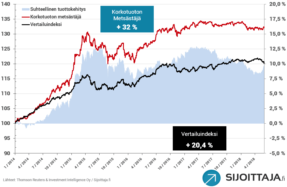 Korkotuoton Metsästäjä jäi toukokuussa nollille ja vertailuindeksi laski -1,0 %. Vuoden alusta Korkotuoton metsästäjä on laskenut 1,2 % ja vertailuindeksi on laskenut 0,4 %. Vuonna 2017 Korkotuoton metsästäjä tuotti 1,6 % ja vertailuindeksi 2,2 %. Korkosalkkumme tavoittelee n. 4 %:n vuotuista tuottoa kaikissa markkinatilanteissa. Vuosina 2014-2016 mallisalkun tuotto on vaihdellut noin 6-16 % välillä.