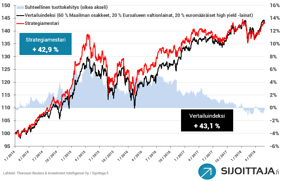 Strategiamestari-mallisalkku nousi toukokuussa 1,8 % ja vertailuindeksi 1,7 %. Vuoden alusta Strategiamestari on tuottanut +0,8 % ja vertailuindeksi +1,6 %. Strategiamestari tuotti vuonna 2017 4,9 % ja vertailuindeksi 6,4 %.