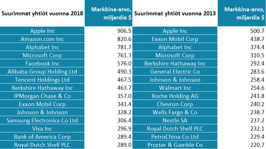 Maailman suurimmat yhtiöt kesäkuun lopussa 2018 olivat Apple, Amazon, Alphabet (Google), Microsoft ja Facebook. Näistä käytetään myös nimitystä FAAMG-yhtiöt.